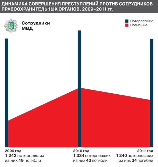 В 2009 г. от преступлений пострадали 1 тысяча 242 работника МВД (из них 19 погибли), а в 2010-м — 1334 (43 погибли), т.е. рост количества пострадавших — на 7,4%, а погибших — аж на 126,4%. В 2011-м потерпевших работников МВД — 1240 (34 погибли).