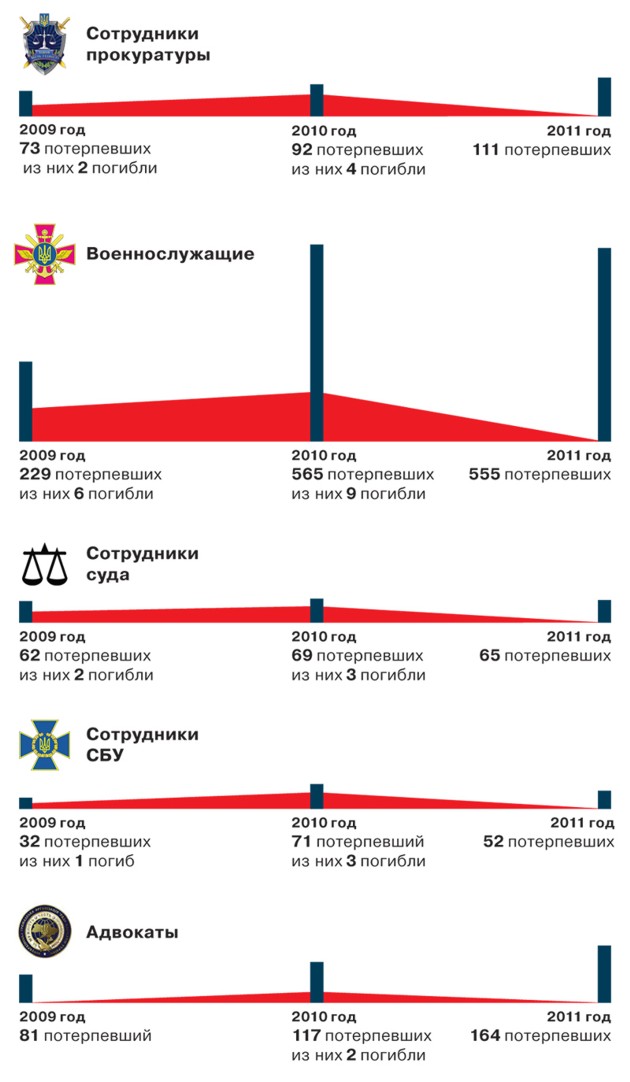 Работников прокуратуры в 2009 г. пострадало 73 (из них 2 погибли), в 2010-м — 92 (4 погибли). Рост количества пострадавших — 26%. В 2011-м потерпевших — 111.