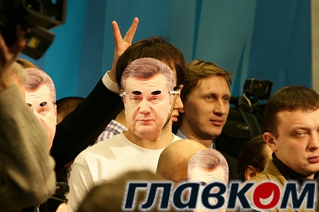 На этот раз несколько киевских журналистов надели маски с изображением Януковича, что гаранта несколько напрягло. Увидев флеш-моб, когда поднимался на сцену, он широко улыбнулся и сел за свой стол, видимо, ожидая какого-то продолжения перформанса. Но так как ничего не происходило, пауза затянулась, и Виктор Федорович поинтересовался у застывшего пресс-секретаря Дарки Чепак, может ли он начинать.