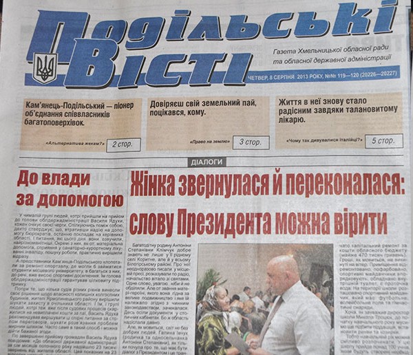 Та про все по порядку. Перша сторінка чергового номера газети «Подільські вісті» (№№ 119-120 від 8 серпня) вийшла повністю присвяченою підсумкам телевізійного проекту «Діалог з країною». Дві публікації «До влади за допомогою» і «Жінка звернулася й переконалася: слову Президента можна вірити» в один голос популяризують діяльність першої особи країни. За приклад узяли багатодітну матір з Білогірського району Антоніну Клімчук, яка звернулася через проект «Діалог з країною» до Президента Януковича з проханням про відзначення її почесним званням «Мати-героїня».