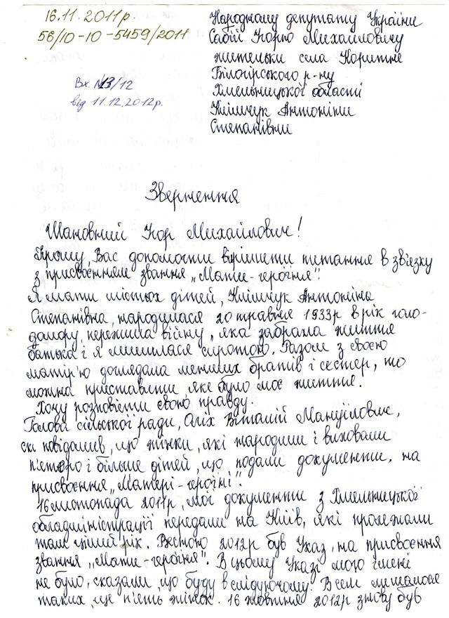 «Голова сільської ради Віталій Оліх мені повідомив, що жінки, які народили і виховали п’ятеро і більше дітей, подали документи на присвоєння «Матері-героїні». 16 листопада 2011 року (запам’ятайте цю дату) мої документи з Хмельницької облдержадміністрації передали на Київ, які пролежали там рік. Весною 2012 року був виданий Указ Президента про присвоєння звань “Мати-героїня”. В цьому Указі мого прізвища не було, сказали, що буду в наступному», — пише багатодітна матір.