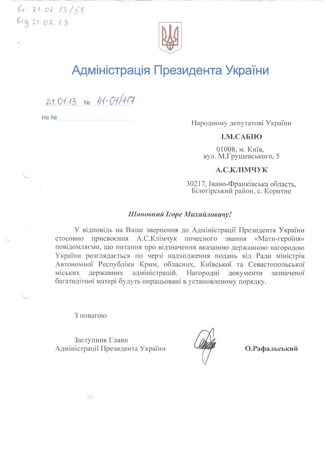 Після звернення до свободівця пані Клімчук разом із нардепом Сабієм 21 січня 2013 року (за місяць до «Діалогу з країною!) отримали відповідь від заступника глави Адміністрації Президента Олега Рафальського, який пообіцяв, що багатодітна матір отримає нагороду «в установленому порядку».