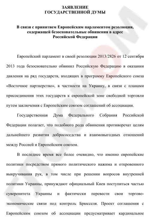 Сегодня Госдума, после душевных дебатов ответила своим коллегам из Европарламента, которые попытались остудить пыл Кремля в давлении на страны «Восточного партнерства», в том числе, Украину.