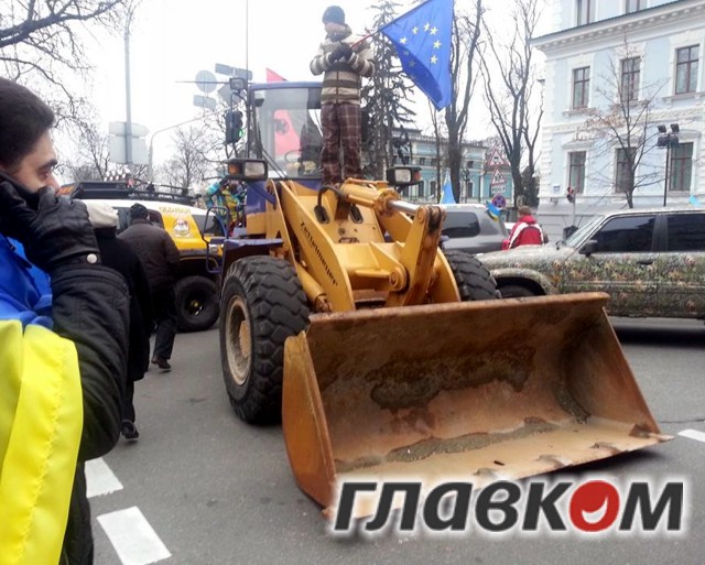 13:42 Участники акции за евроинтеграцию двинулись от Майдана Незалежности к Администрации президента. Впереди едет экскаватор с протестующими.