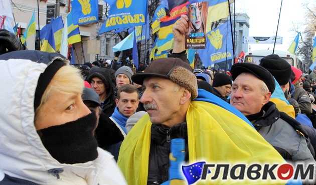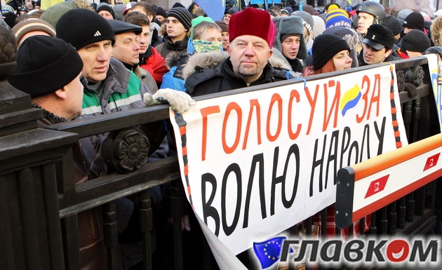 «…Ведь мы – гражданская гвардия нашего президента Виктора Федоровича Януковича!», - залізним голосом чеканив новий спікер. «Гвардія» під сценою, переважно жіночки похилого віку, з нещасним виглядом трималися за древка прапорів і ловила дрижаки від холоду. А промовець, рубаючи повітря рукою, кричав: «Украина – часть европейской семьи! Европа – в каждом из нас!». «Тітушкам про це розкажи!», - гукали йому з-за паркану.