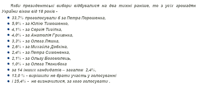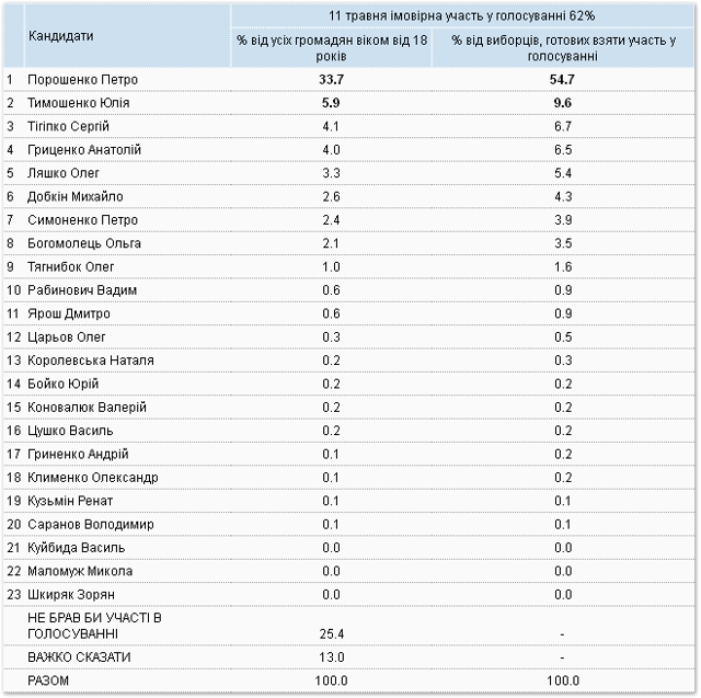 З 29 квітня по 11 травня 2014 року Київський міжнародний інститут соціології (КМІС) провів всеукраїнське опитування громадської думки. Методом особистого інтерв'ю опитано 2022 респонденти, що мешкають у 110 населених пунктах усіх областей України (за виключенням АР Крим) за стохастичною вибіркою, репрезентативною для населення України віком від 18 років.