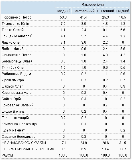 Розподіл прихильників кандидатів у регіонах (% від усіх мешканців регіону віком від 18 років)