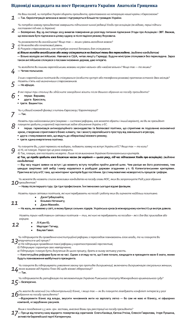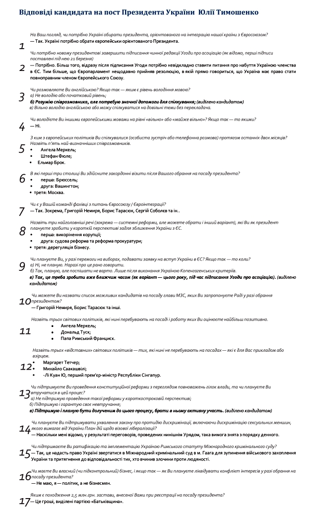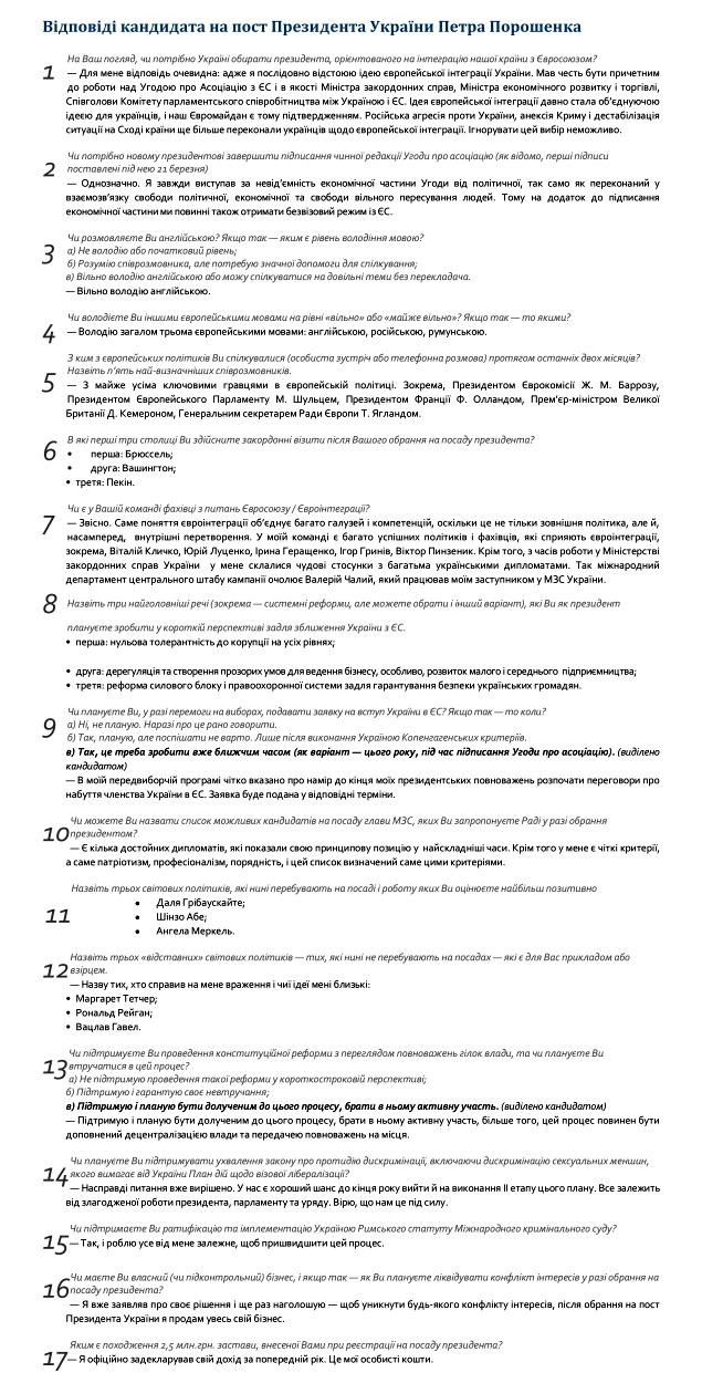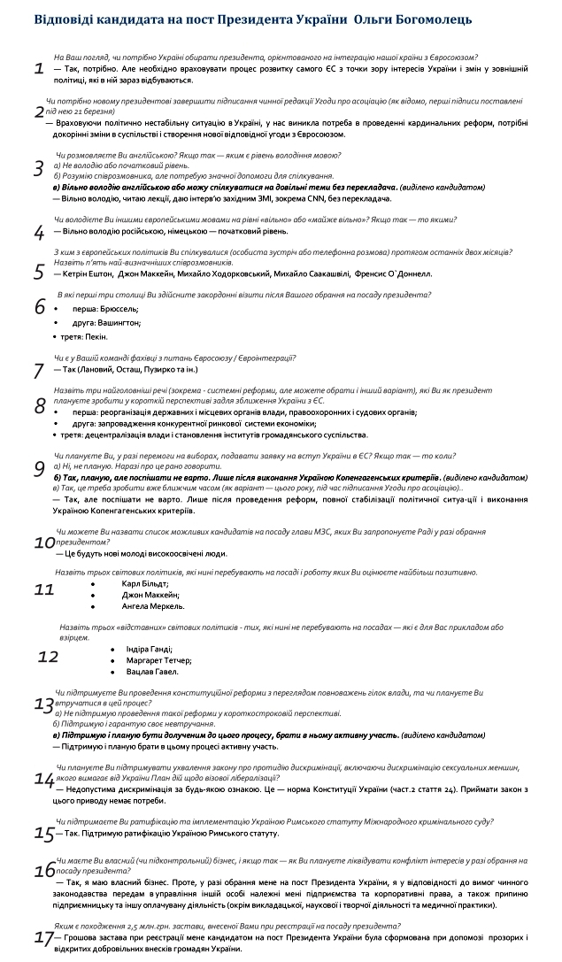 • Нарешті, ми особисто звернулися до кандидатів з опитувальником, складеним із 17 тестових, індикативних запитань.