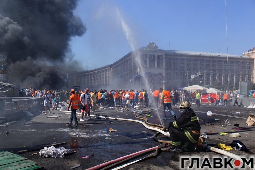 Несколько автомобилей пожарных попытались потушить огонь, однако попытки не увенчались успехом. У одного из протестующих правоохранители в штатском отобрали заряженный пистолет и якобы гранату РГД-5. По их словам, сотрудники МВД изъяли оружие еще у нескольких «жителей» Майдана.