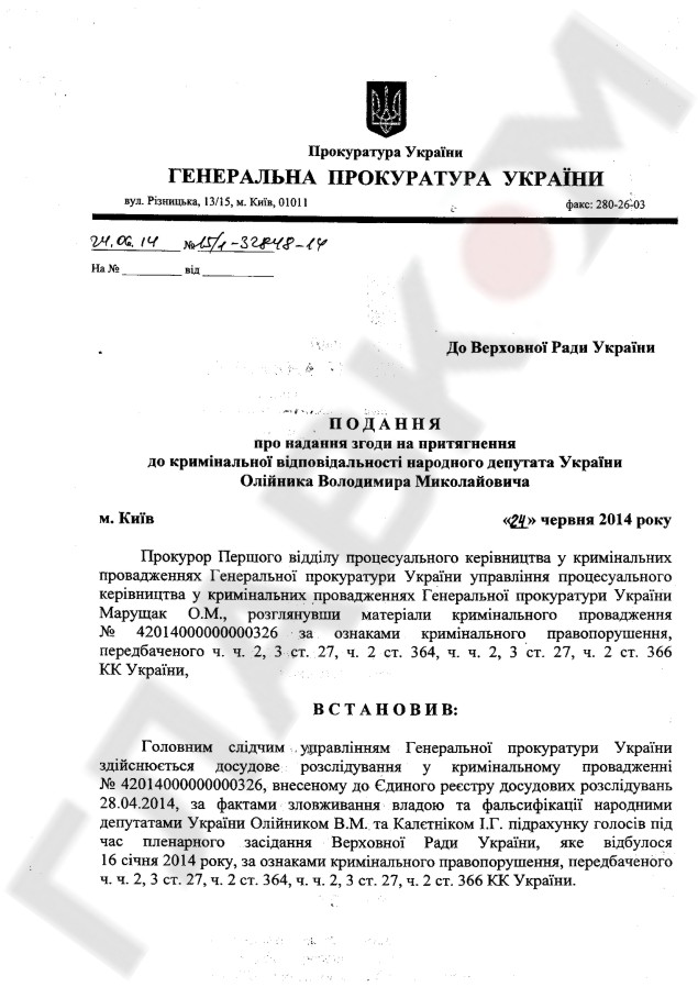Автору вдалося отримати копію подання Яреми про надання згоди на притягнення до кримінальної відповідальності народного депутата Володимира Олійника.