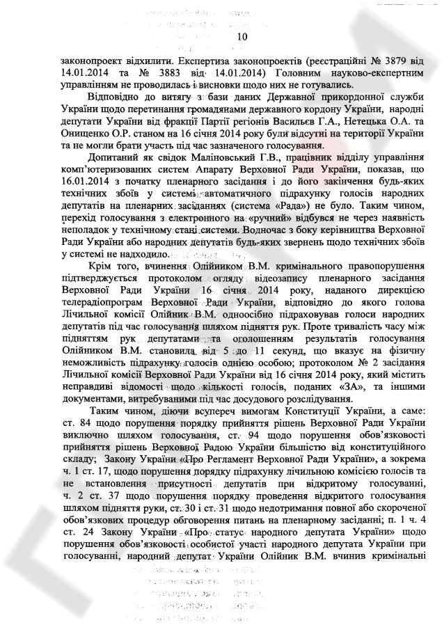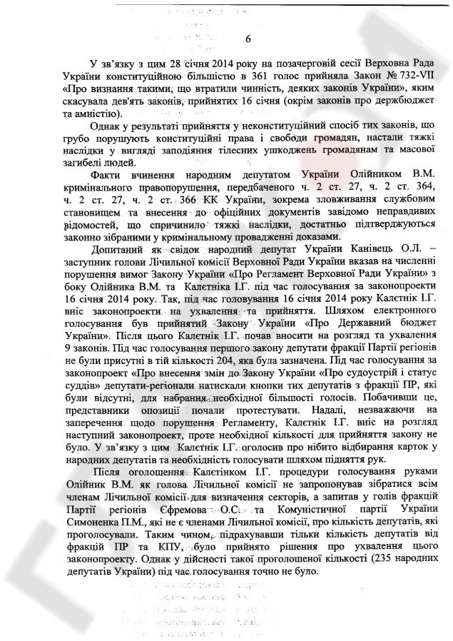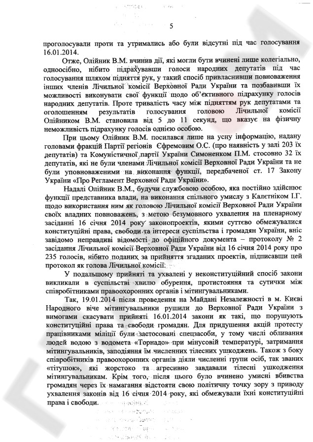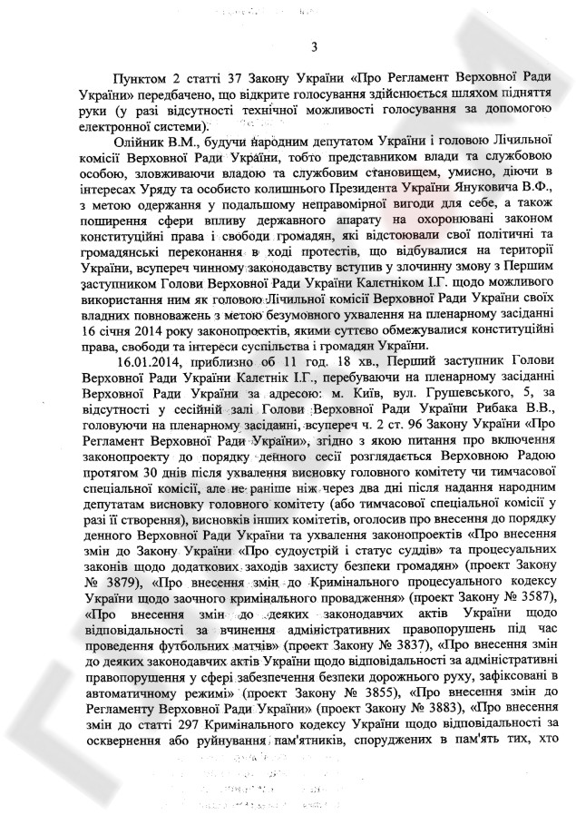 Як зазначено у документі, Володимир Олійник, будучи народним депутатом України і головою Лічильної комісії Верховної Ради України, тобто представником влади та службовою особою, зловживаючи владою та службовим становищем, умисно, діючи в інтересах Уряду та особисто колишнього президента Януковича, з метою одержання у подальшому неправомірної вигоди для себе, а також поширення сфери впливу державного апарату на охоронювані законом конституційні права і свободи громадян, які відстоювали свої політичні та громадянські переконання в ході протестів, що відбувалися на території України, всупереч чинному законодавству вступив у злочинну змову з першим заступником голови Верховної Ради України Ігорем Калєтніком щодо можливого використання ним як головою Лічильної комісії Верховної Ради України своїх владних повноважень з метою безумовного ухвалення на пленарному засіданні 16 січня 2014 року законопроектів, якими суттєво обмежувалися конституційні права, свободи та інтереси суспільства і громадян України.