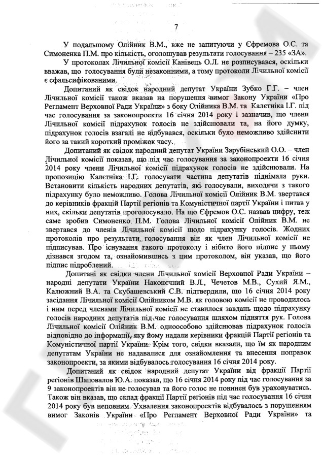 Під час слідства у Генпрокуратурі допитали як свідків багатьох нардепів, в тому числі членів лічильної комісії Наконечного, Чечетова, Сухого, Калюжного та Скубашевського. Вони підтвердили, що 16 січня 2014 року засідання Лічильної комісії Олійником як головою комісії не проводилось. Він не ставив завдання членам лічильної комісії щодо підрахунку голосів народних депутатів. Під голосування шляхом підняття рук Олійник одноособово здійснював підрахунок голосів відповідно до інформації, яку йому надали керівники фракцій Партії регіонів та Комуністичної партії. Крім того, свідки вказали, що їм як народним депутатам не надавалися для ознайомлення та внесення поправок законопроекти, за якими відбувалось голосування 16 січня 2014 року.