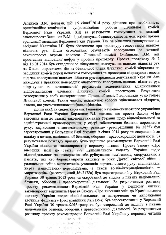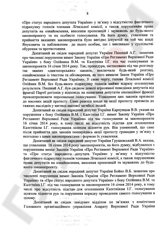 Сфальшовані результати голосування були оформлені в протоколі, диктаторські закони нібито вступили в силу. Що було далі, вже стало історією. У поданні Генпрокуратури зазначено, що у подальшому прийняті та ухвалені у неконституційний спосіб закони викликали в суспільстві хвилю обурення, протистояння та сутички між співробітниками правоохоронних органів і мітингувальниками. Це – ті тяжкі наслідки, які, згідно із Кримінальним кодексом України, посилюють відповідальність Олійника та Калєтніка за їх діяння.