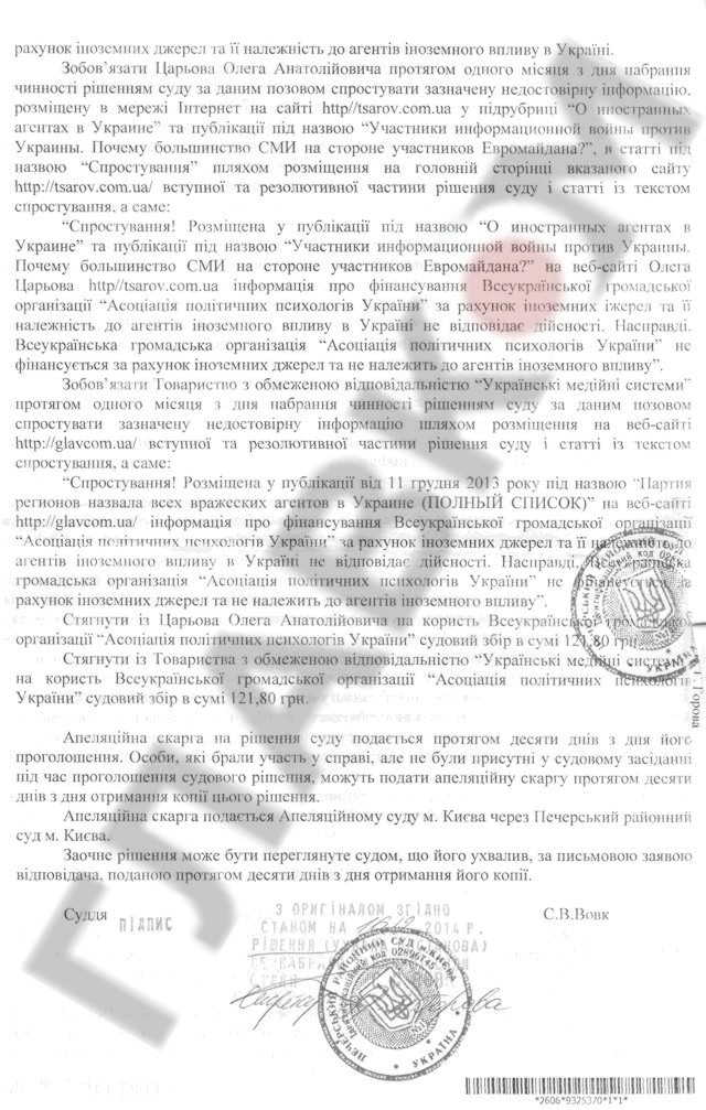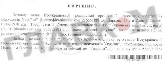Розміщена у публікації від 11 грудня 2013 року під назвою «Партия регионов назвала всех вражеских агентов в Украине (ПОЛНЫЙ СПИСОК) на веб-сайті http://glavcom.ua/ інформація про фінансування Всеукраїнської громадської організації «Асоціація політичних психологів України» з іноземних джерел та її належність до агентів іноземного впливу в Україні не відповідає дійсності.