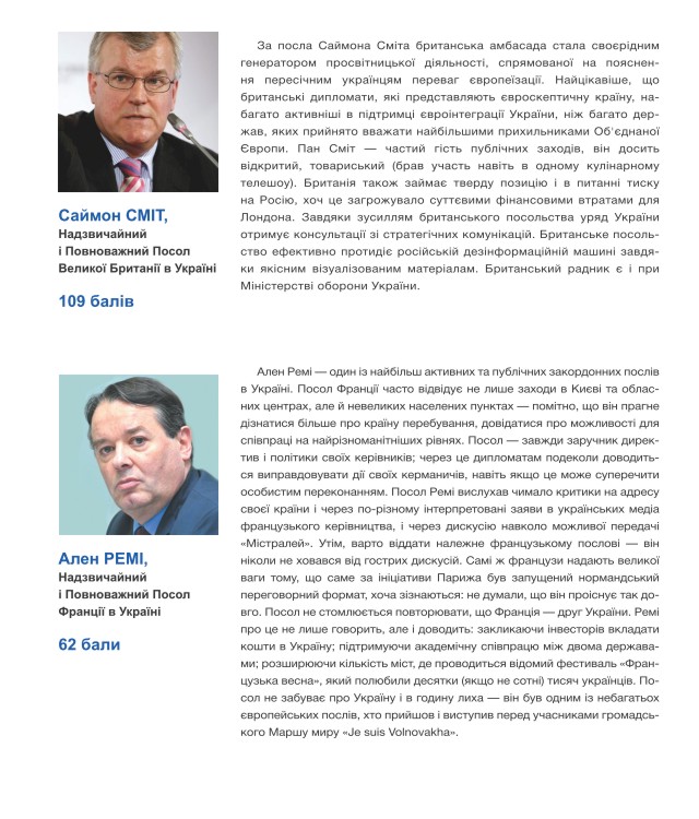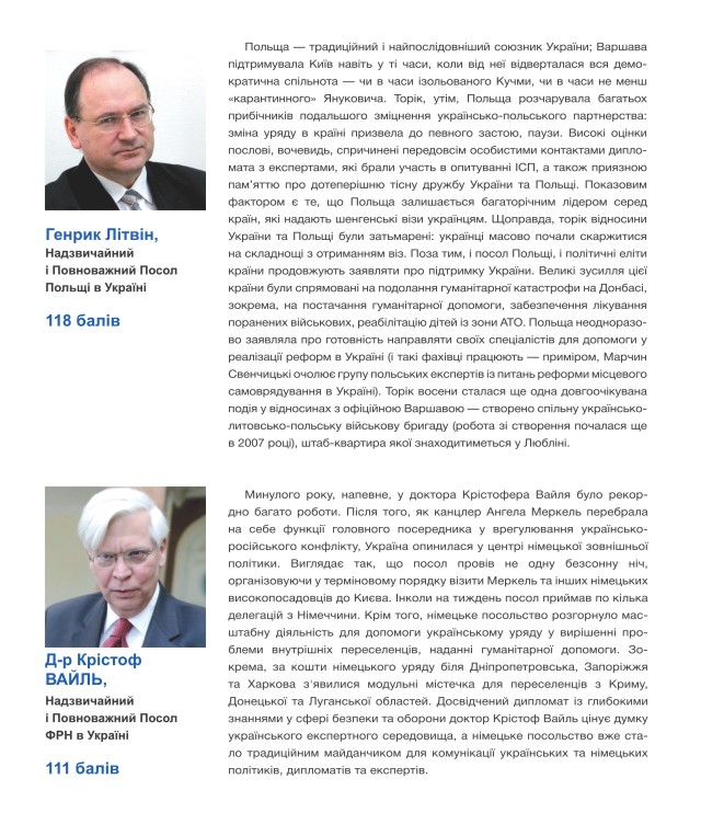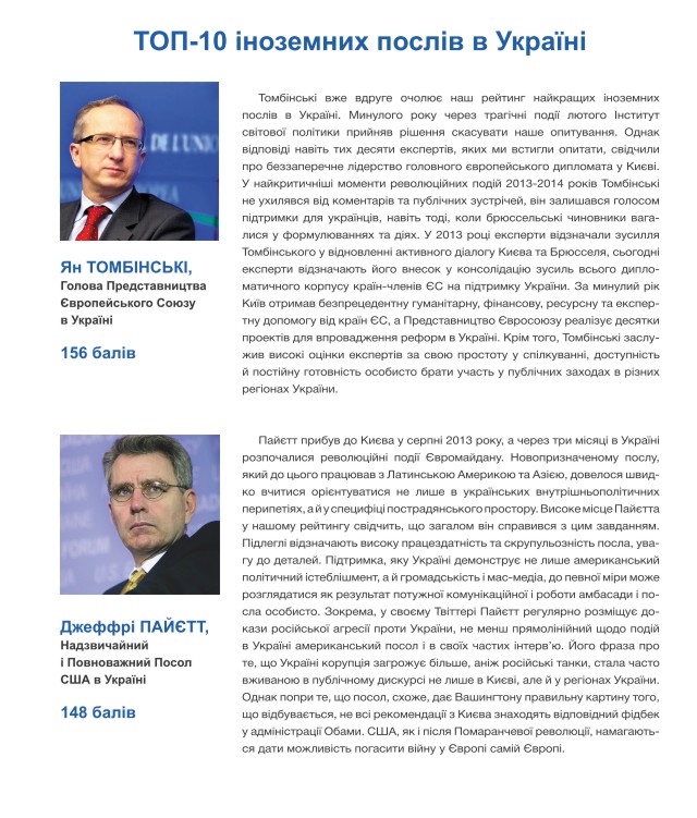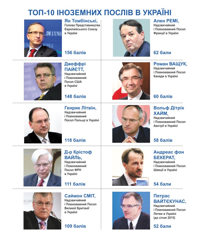Що ж стосується іноземних послів в Україні, то лідерство знову за послом ЄС Яном Томбінські. Симптоматично, що, як і два роки тому, він випередив представника США, ім’я і прізвище якого, втім, відтоді змінилося. Однак, варто зауважити, що розрив між послами ЄС та США дуже несуттєвий. До іноземної дипломатичної десятки увійшли посли країн, які найактивніше підтримували Україну і політично, і гуманітарно, і фінансово.