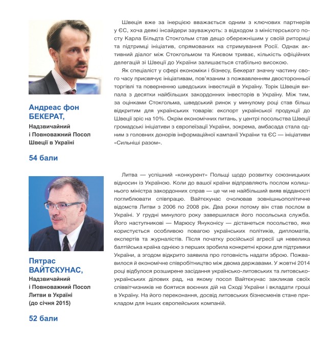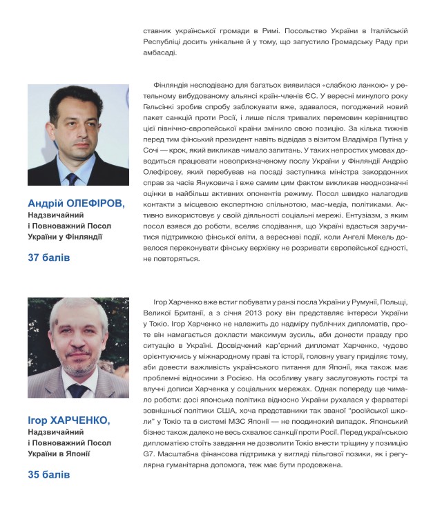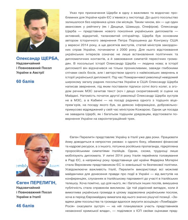 Слід, однак, зауважити, що цього разу виникли певні труднощі із формуванням списку українських послів, оскільки протягом майже восьми місяців низка дипломатичних представництв України, зокрема, й у досить важливих країнах, залишилась без керівників. До списку були внесені всі дипломати, які обіймали свої позиції станом на грудень 2014 року. Звичайно, ми усвідомлюємо, що високі бали, які експерти дали українським послам, призначеним лише восени минулого року, є швидше авансом, свідченням позитивних очікувань від їхньої роботи. Разом з тим, ці високі оцінки свідчать про рівень підтримки експертною спільнотою кадрової політики Президента Петра Порошенка у дипломатичній сфері. Загалом, можна говорити про те, що в українській дипломатії відбувається не просто оновлення, але й оновлення за рахунок нового покоління дипломатів: починаючи з міністра закордонних справ особисто і закінчуючи послами.