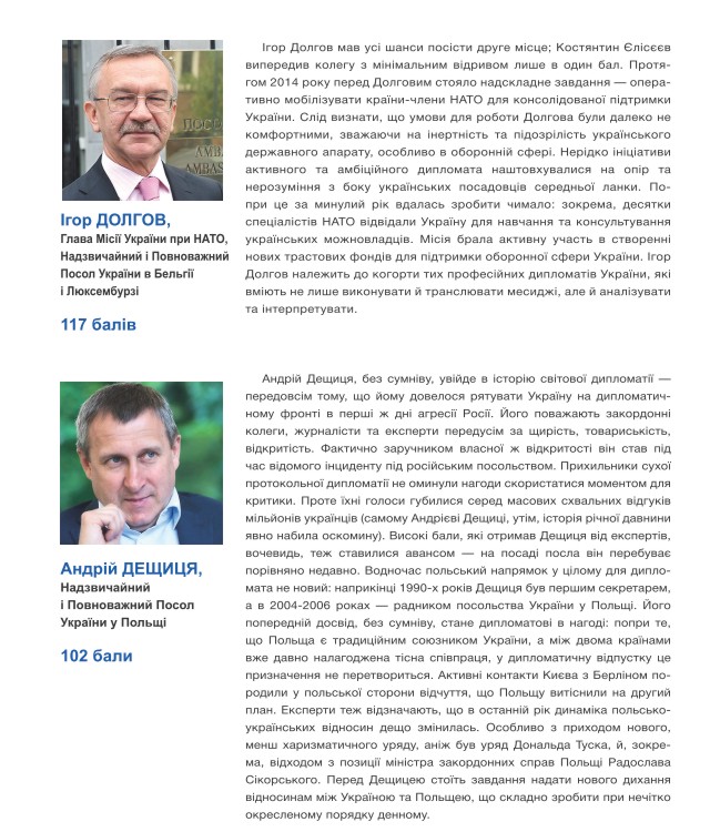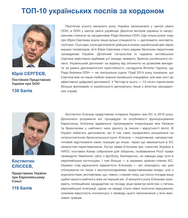 Особливістю цьогорічного рейтингу українських послів є те, що три перші сходинки посіли представники України при міжнародних організаціях – ООН, ЄС та НАТО. Це й не дивно, адже виклики світового масштабу, з якими зіткнулася у 2014 році Україна, вимагали і відповіді світового масштабу. Таким чином, експерти високо оцінили внесок Юрія Сергеєва, Костянтина Єлісєєва та Ігоря Долгова у мобілізацію міжнародних зусиль на підтримку Києва та донесенні потрібних сигналів про ситуацію в Криму та на Сході України.