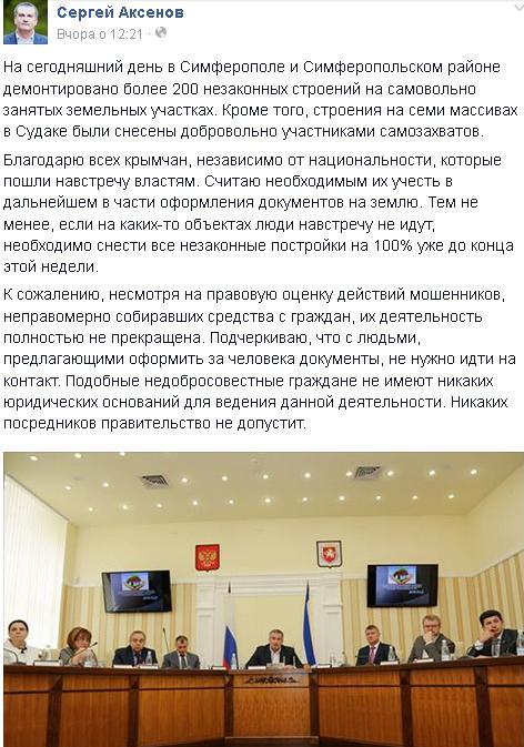 Я же говорю, чиновники ведь старые остались. Я привык оперировать фактами. Я говорю о тех местах, по которым есть решения еще украинских судов, которые в РФ легитимны. Если они (власти Крыма) и вот эти решения не могут выполнить, о каком недельном сроке мы вообще говорим? А говорить о том, кто хочет на этом заработать… У нас теперь есть для этого ФСБ, полиция, пусть они занимаются, это их работа.