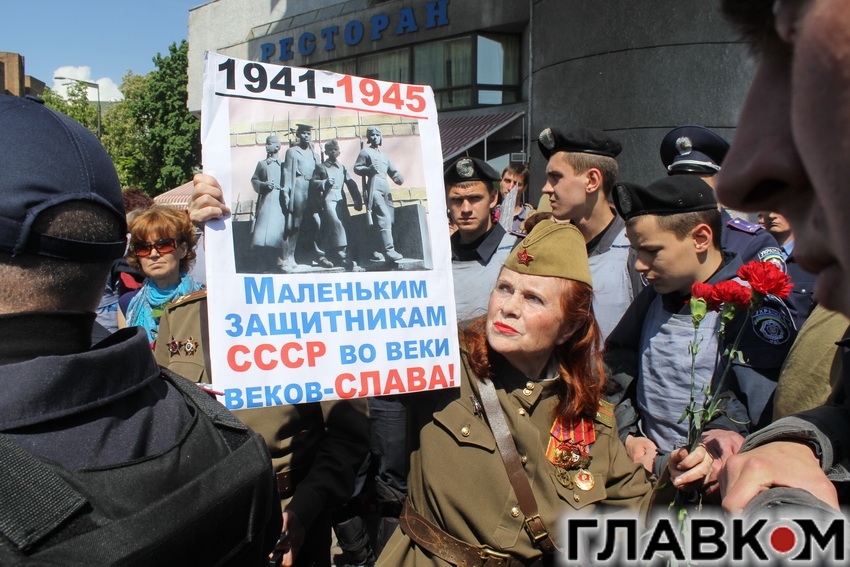 Куда веселее было с группой людей, которые появились на подходах к парку Славы с лозунгом «Маленьким защитникам СССР во веки веков слава» и портретом Сталина. Этот перфоманс спровоцировал конфликт. «Сталин – убийца крымских татар. Идолопоклонники, язычники!», – кричал им седовласый мужчина в камуфляже с маком на груди, которые, кстати, раздавали в неограниченном количестве волонтеры. Милиция взяла сталинистов в окружение, в котором они, в итоге, и прошли к памятнику.