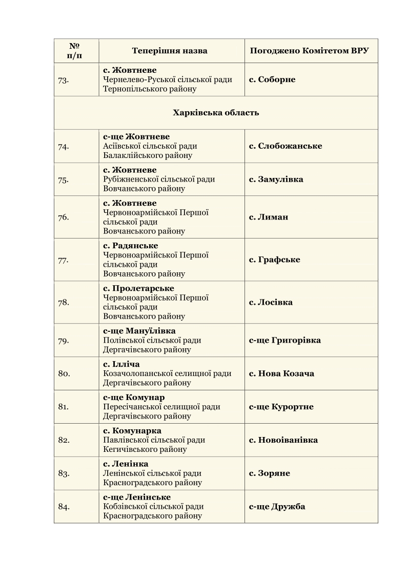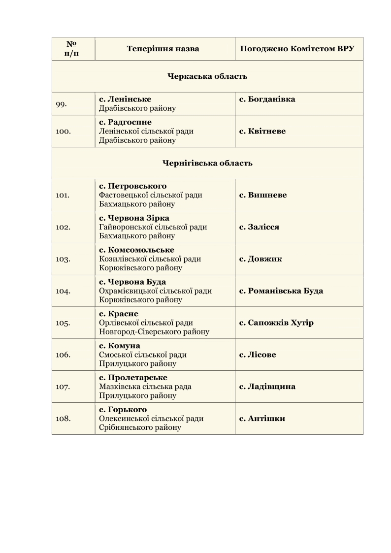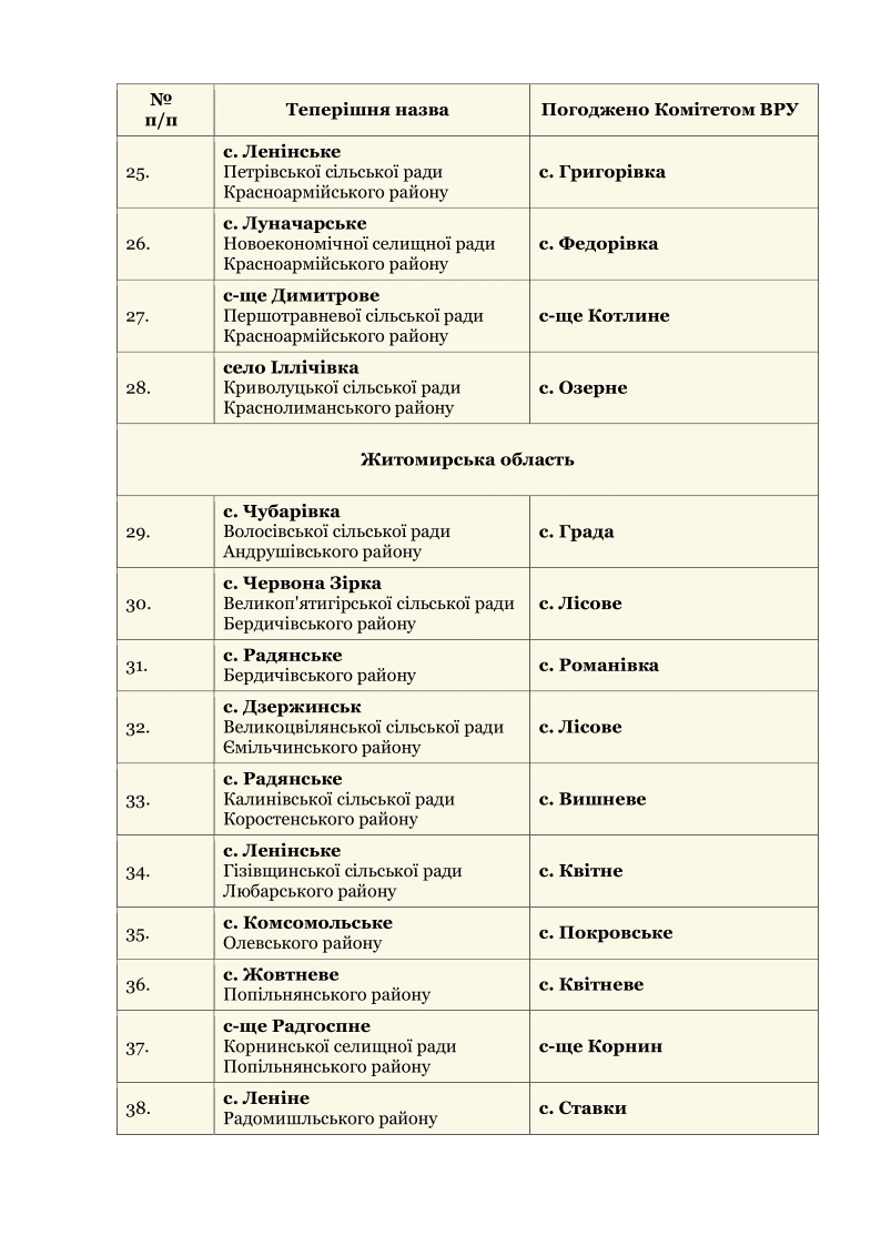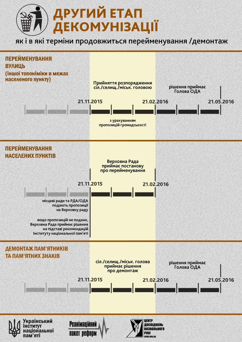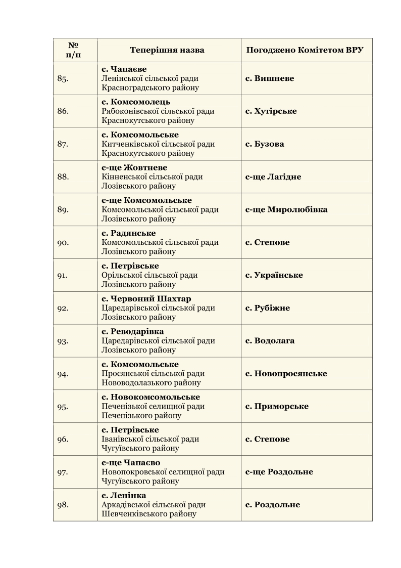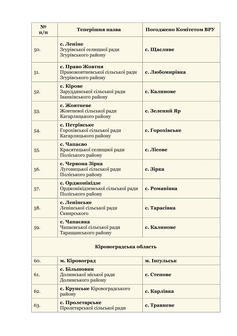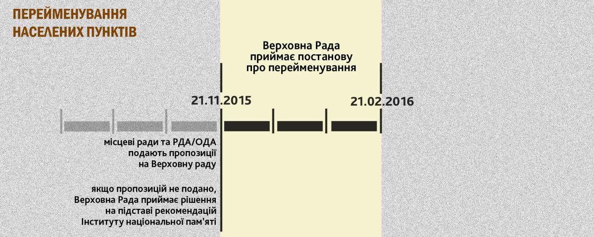 Нагадаємо, що триває другий етап декомунізації згідно Закону «Про засудження комуністичного та націонал-соціалістичного (нацистського) тоталітарних режимів в Україні та заборону пропаганди їхньої символіки». До 21 лютого Парламент України на підставі подань місцевих громад має визначитися із новими назвами для 941 населеного пункту: 32 міст, 56 селищ міського типу, 118 селищ та 735 сіл.