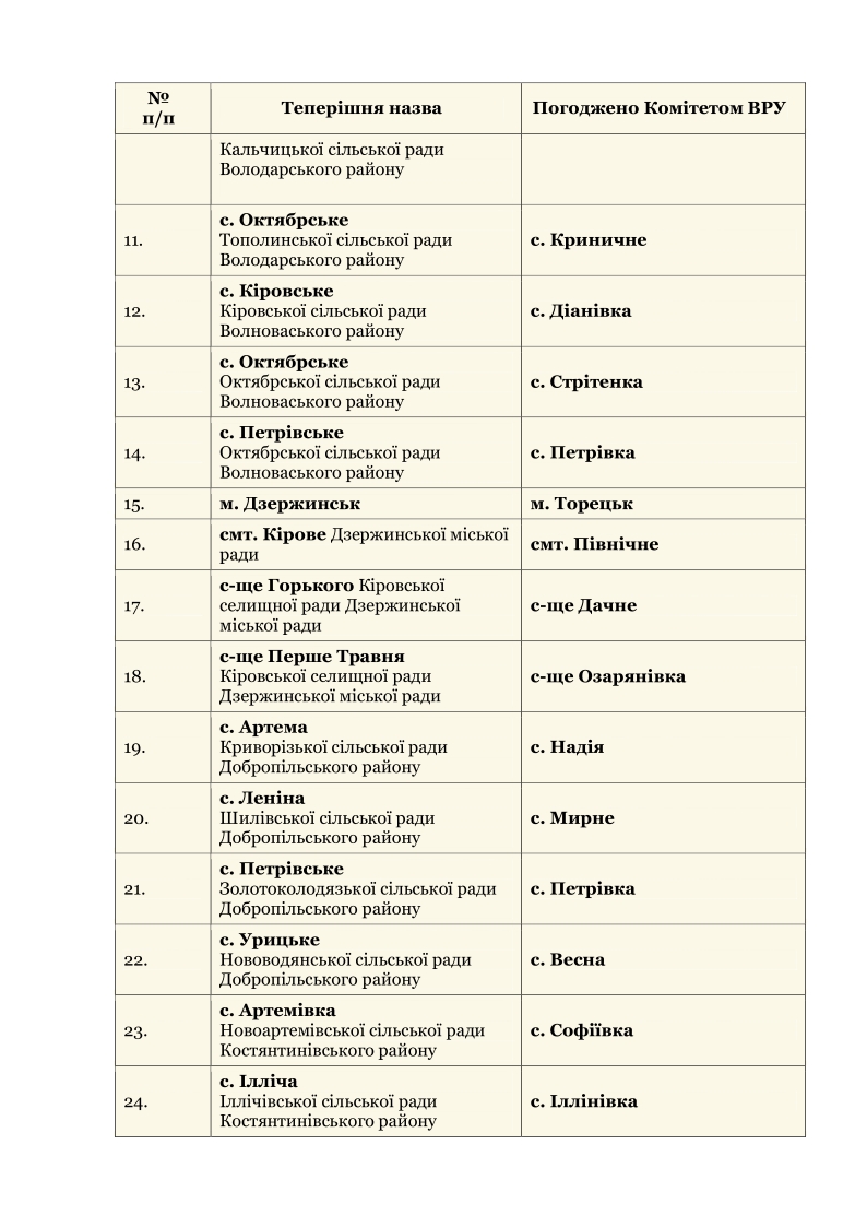Артемівськ стане Бахмутом, Кіровоград називатиметься Інгульськом, Дзержинськ – Торецьком, а Іллічівськ – Чорноморськом. Крім цього, нові назви отримають ще 104 села, селища та райони, серед яких аж 18 з іменем Ілліча або Леніна. Таке рішення парламентського комітету в рамках втілення реформи з декомунізації.