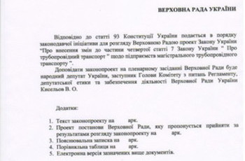 Бывший член фракции Партии регионов, а ныне внефракционный народный депутат Василий Киселев подготовил проект изменений в Закон «О трубопроводном транспорте». Это тот самый закон, которым в феврале 2007 года Рада запретила передачу украинских газопроводов в частные руки или собственность других государств. В нем до сих пор абсолютно четко записано, что «реорганизация (слияние, присоединение, деление, преобразование) государственных предприятий магистрального трубопроводного транспорта, а также их приватизация запрещаются».