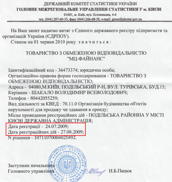 Згідно з випискою Держкомстату, ця фірма була зареєстрована 24 липня 2009 року. А вже через сорок днів, 3 вересня 2009 року, на неї було оформлено право власності на будівлю по вулиці Турівській, 15.