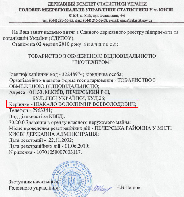 Крім посади директора у фірмі «МЦ – Файнанс», Володимир Шакало значиться директором у другій фірмі – «Екотехпром». За цим товариством з обмеженою відповідальністю значиться другий офіс Тимошенко по вулиці Турівська, 13 площею 3 970 метрів.