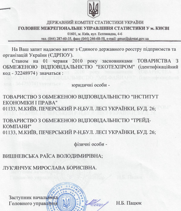 Перший засновник на 0,07% - це ТОВ «Інститут економіки та права», що має стосунок до Олександра Турчинова і зареєстроване за адресою бульвар Лесі Українки, 26 - де знаходяться частина департаментів партії «Батьківщина».