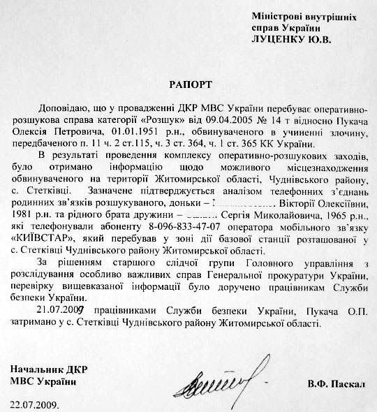 «Українській правді» також стали відомими деякі подробиці арешту Пукача в липні 2009 року.