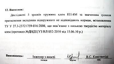 «Комсомолке» удалось раздобыть заключения государственной научно-исследовательской лаборатории железнодорожного транспорта Украины. Эти исследования заказаны киевским Главным управлением по борьбе с организованной преступностью. Расследуя воровство бюджетных гривен, которые должны были идти на реконструкцию трамвая, оперативники проверили качество креплений ИМЕТ (производитель - акционерное общество «Механика». Именно их решил использовать «Киевпастранс». - Авт.), которые удерживают скоростные рельсы. Несколько образцов отправили в лабораторию.