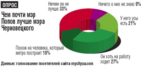 – Рейтинг Попова вырос до 9%. Несмотря на принадлежность к команде «донецких», которых, судя по результатам нескольких последних выборов, киевляне недолюбливают, рейтинг Попова в Киеве растет. Более 9% поддержки за три месяца работы (данные Центра Разумкова) при том, что до прихода в мэрию киевляне его практически не знали, то есть рейтинг Попова был, можно сказать, равен нулю, – таких темпов завоевания симпатий «электората» в Киеве еще не демонстрировал, пожалуй, никто.
