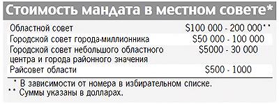 Проходное место в городской совет города-миллионика на «черном рынке» в августе-сентябре предлагали за 50 тысяч долларов. За пределами же Киевской области или крупного города цены были в десять раз меньше. В небольших областных центрах за мандат просили около 5 тысяч долларов, а в райсоветы - от 500 до 1 тысячи.