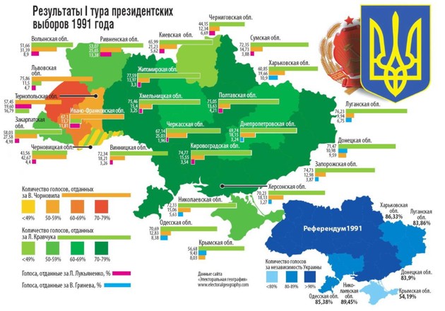 В обоих случаях результат был неоспоримо высок: в первом же туре набрал без малого 62% глава Верховной Рады Леонид Кравчук, а Акт провозглашения независимости Украины поддержали более 90% граждан. Завидное и недостижимое с тех пор единодушие. Через неделю Кравчук подпишет Беловежские соглашения и – гуд бай, СССР!
