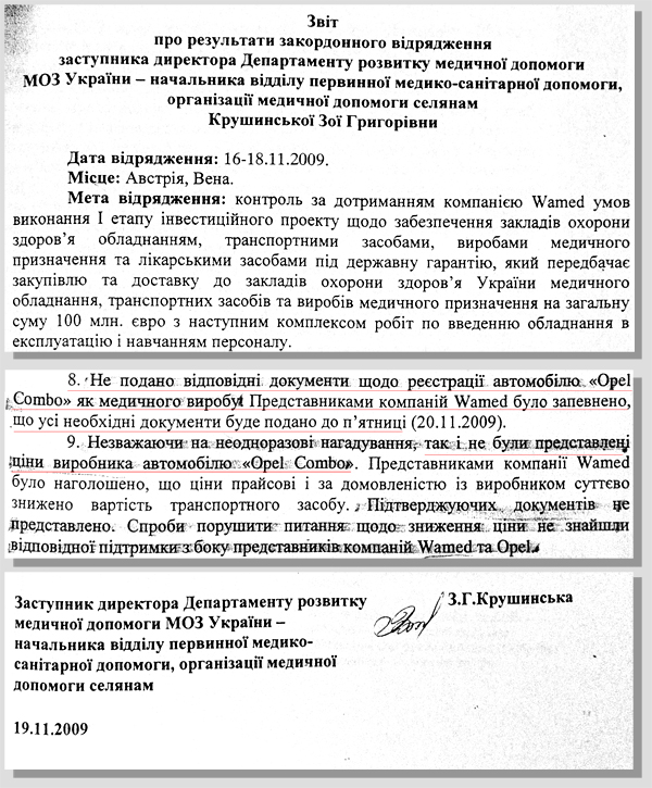 Згідно з процедурою, перед купівлею автомобілів до Австрії поїхала делегація МОЗ України, щоб запевнитись у якості продукції, яку планувалось придбати. В розпорядженні «Української правди» є звіт про результати цього закордонного відрядження, підписаного заступником директора Департаменту розвитку медичної допомоги МОЗ України Крушинською З.Г.