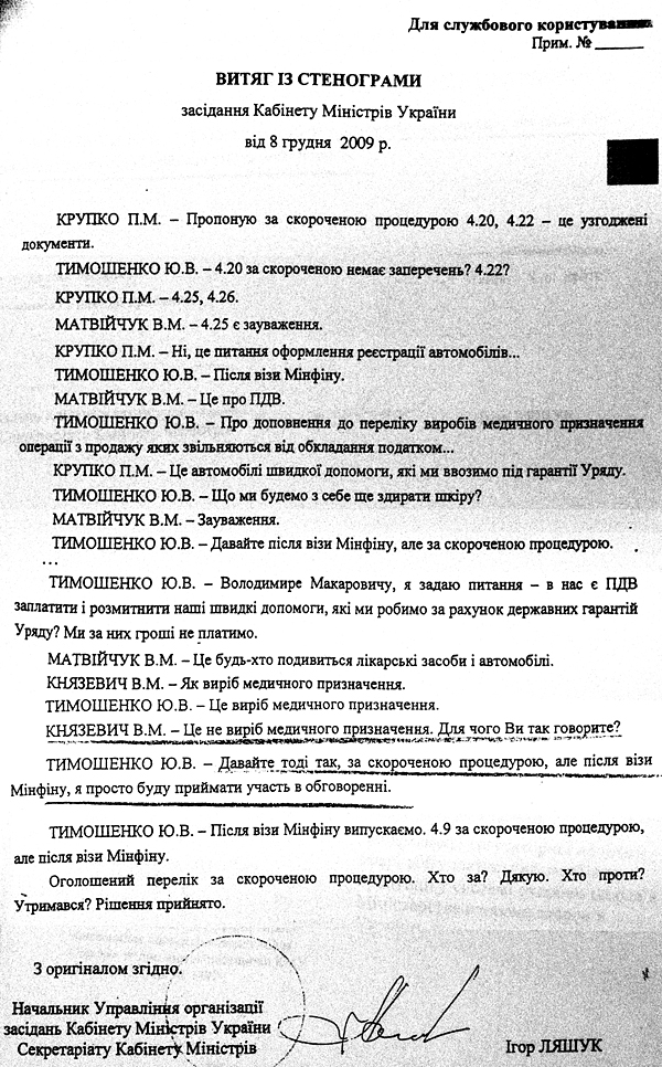 Тим не менш, питання було винесено на засідання Уряду. Під час розгляду проекту постанови між Юлією Тимошенко та міністром охорони здоров’я Князевичем сталась словесна перепалка, під час якої прем'єр намагалася переконати присутніх, що уряд збирається розмитнити саме машини швидкої допомоги, а не звичайні автомобілі.