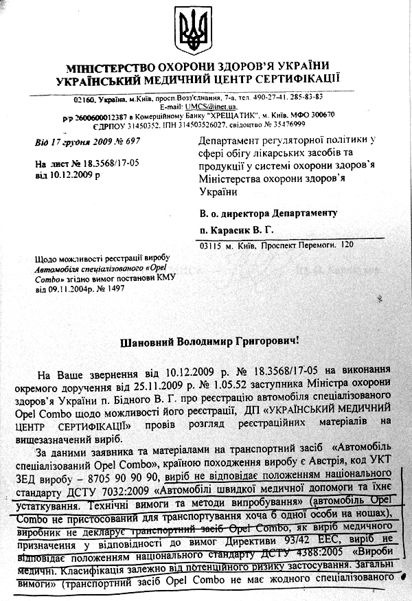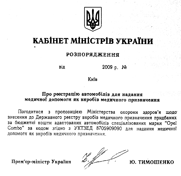 Зокрема, було підготовлено проект постанови Кабінету міністрів «Про реєстрацію автомобілів для надання населенню України медичної допомоги, як виробів медичного призначення». Не дивлячись на вказівку уряду про підготовку такого документу, навіть на останньому етапі фахівці не надавали згоди про визнання «Opel Combo» машинами швидкої допомоги.