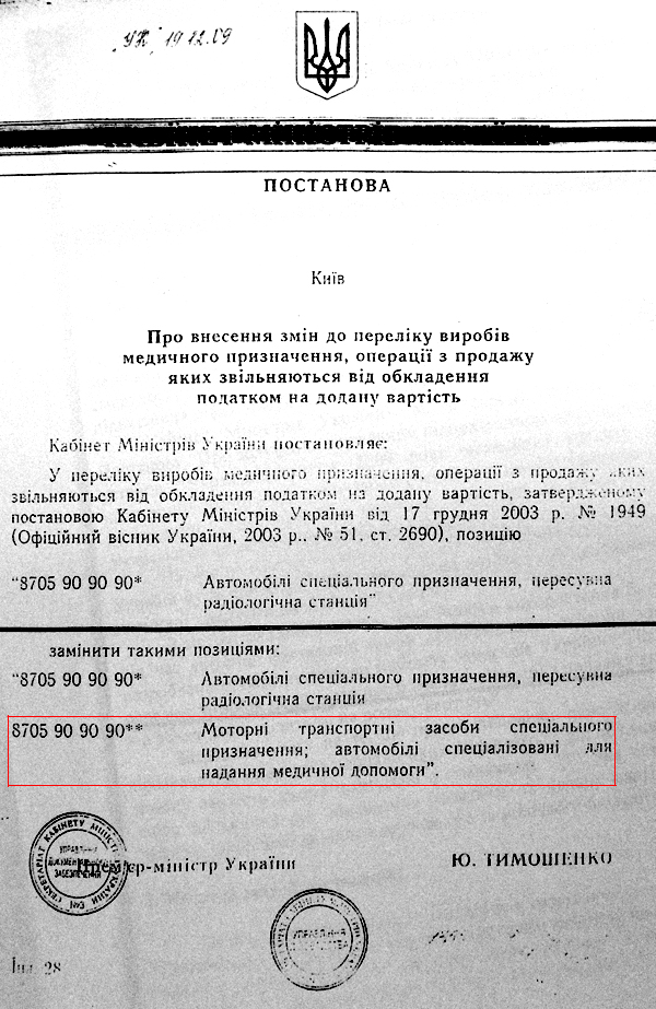 Іншою постановою Юлія Тимошенко просить внести поправки у перелік виробів медичного призначення, операції з продажу яких звільняються від обкладення податком на додану вартість.