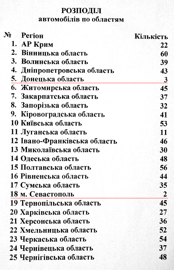 «Українській правді" вдалося дістати і розподіл вищевказаних тисячі автомобілів по регіонах України.