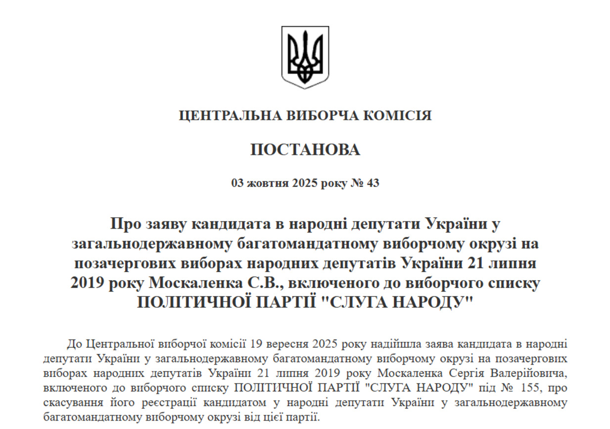 На радість керівництву «Слуги народу», він також взяв «самовідвід», але зробив перед цим театральну паузу. Постанова ЦВК з рішенням про скасування реєстрації Москаленка з’явилася лише 3 жовтня. Відповідну заяву той подав 19 вересня.