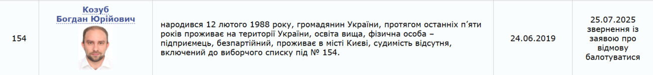 Але Козуб зв’язуватися з депутатською кар’єрою зрештою передумав. Своє звернення із відмовою балотуватися, згідно з інформацією з сайту Центральної виборчої комісії, він подав ще 25 липня.