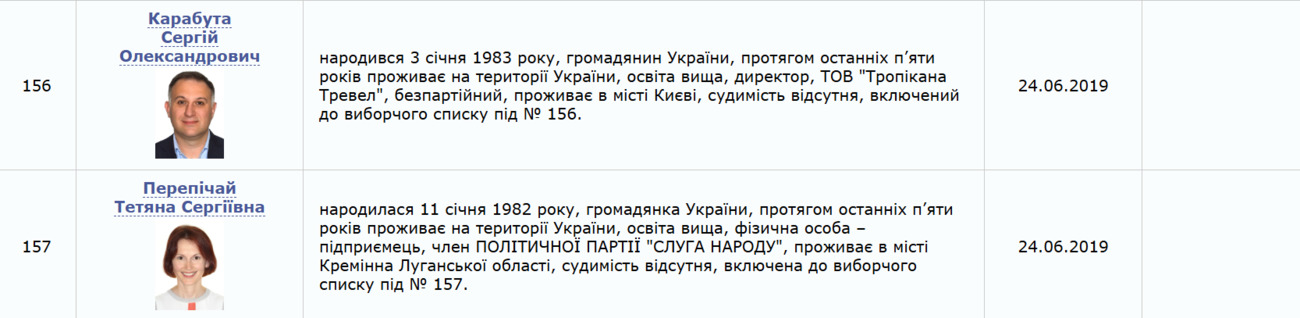 Після «самоліквідації» цієї парочки нагору по списку «слуг» піднялися керівник туристичної агенції «Тропікана-тревел» киянин Сергій Карабута (№ 156) та фізична особа-підприємець Тетяна Перепічай, що на момент виборів проживала в нині окупованому місті Кремінна на Луганщині (№157, наразі Перепічай числиться помічницею на громадських засадах нардепки з «кварталівським» минулим Олени Хоменко). В компрометуючих зв’язках вони досі помічені не були.