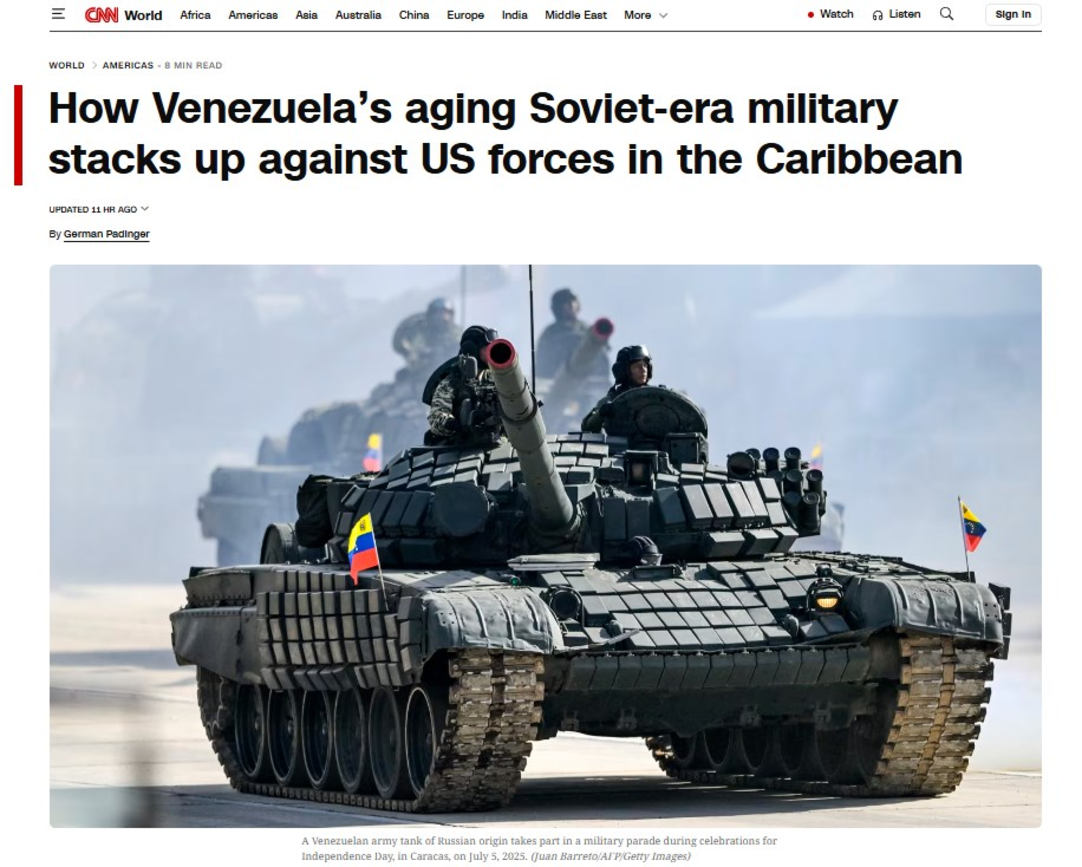 CNN веде далі, що в результаті такі системи озброєння, як винищувачі Су-30, бойові танки Т-72, С-300, зенітно-ракетні комплекси «Печора» та «Бук», переносні системи «Ігла-С» та автомати Калашникова – усі розроблені за радянських часів. Цей арсенал відрізняє венесуельські збройні сили від інших військових у регіоні, які, як правило, більше покладаються на американську або європейську зброю (хоча Венесуела все ще має деяке застаріле обладнання американської розробки з часів «до Чавеса»). «Ця техніка, ймовірно, стане першою ціллю супротивника у разі спалаху конфлікту», – коментує CNN військовий аналітик Андрій Сербін-Понт.
