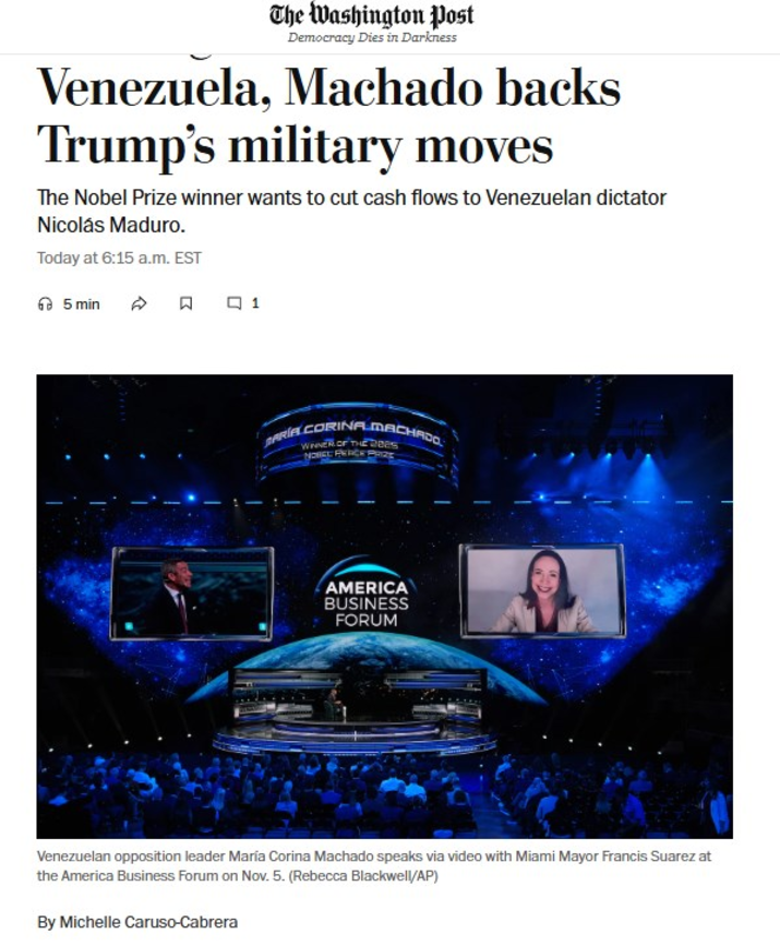 Журналісти нагадують, що коли команда Мачадо почала просувати свій інвестиційний план у Нью-Йорку у червні, ним особливо ніхто не цікавився. Ситуація почала змінюватися наприкінці літа, відколи Трамп наказав ввести тисячі американських військових у регіон, почав атакувати човни ймовірних наркоторговців і чітко заявив, що хоче, щоб Мадуро пішов.