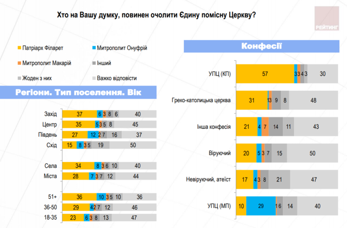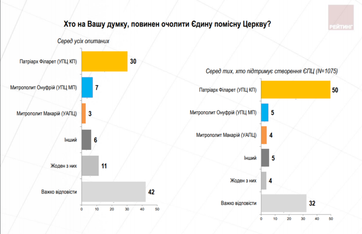 30% усіх опитаних вважають, що очолити Єдину помісну церкву повинен Патріарх Філарет (УПЦ КП). 7% вважають, що очільником має стати Митрополит Онуфрій (УПЦ МП), 3% – Митрополит Макарій (УАПЦ). 11% вважають що жоден з них не повинен очолювати Помісну церкву. 42% поки не сформували стосовно цього питання своєї думки. У середовищі тих, хто позитивно ставиться до створення Єдиної помісної церкви тенденції щодо підтримки можливих очільників цього утворення подібні: Патріарх Філарет користується підтримкою 50%, Митрополит Онуфрій – 5%, Митрополит Макарій – 4%. Третина цієї категорії поки не має думки щодо можливого глави Єдиної помісної церкви.
