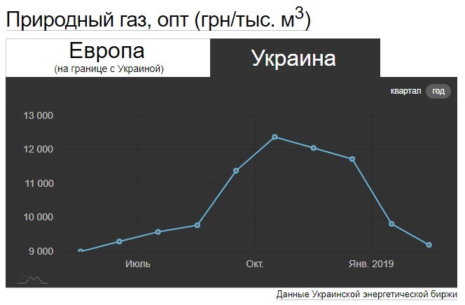 Але оскільки з листопада ціни на газ на європейському ринку почали падати, український ринок почав адекватно реагувати на цю ситуацію: у нас ціни також поповзли вниз. Вже з 1 квітня учасники «Української енергетичної біржі» виставили на торги квітневий ресурс за стартовою ціною 6989 грн за тисячу кубів, а травневий – 6500 грн (з ПДВ). Навіть якщо до наведених цін додати вартість розподілу та постачання газу до кінцевого споживача, все одно вартість на ринку буде значно нижче від встановленої Кабміном для населення – з 1 листопада 2018 року побутовий сектор купує газ по 8549 грн за тисячу кубометрів. А для промисловості – й поготів, адже цінова пропозиція «Нафтогазу» для підприємств у березні була в середньому майже 9,8 тис грн за тис. куб м, а в січні та лютому – майже 12 тис. грн.