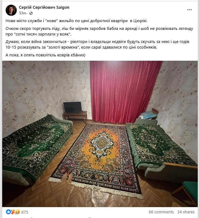 Одним кліком ви знайдете в інтернеті море оголошень про продаж житла в Ізюмі, Краматорську, Слов’янську, Херсоні та інших містах у зоні бойових дій. Ясна річ, 99% споживачів цих оголошень – військові й ті, хто планує придбати квартиру, щоб здавати їм же, «богам, що носять форму ЗСУ».