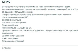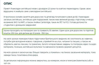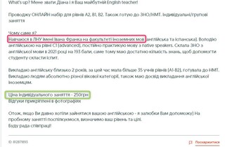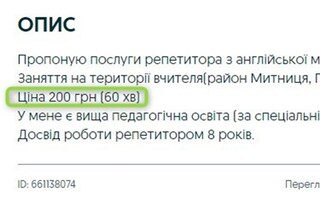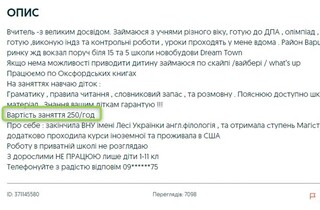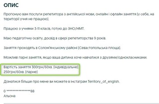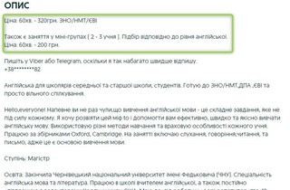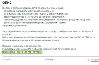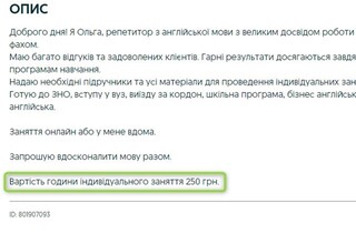 Багато викладачів в оголошенні не вказують вартість своїх послуг – домовитися про ціну пропонують телефоном. Більшість репетиторів працюють онлайн.