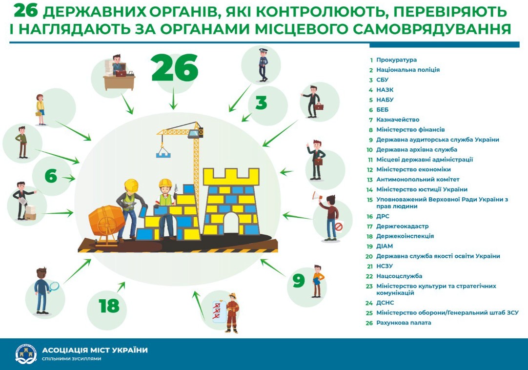 В Україні станом на зараз є 26 державних органів, які контролюють і наглядають за місцевим самоврядуванням. З'явився міф про те, що після децентралізації прокуратура вже не може наглядати за місцевим самоврядуванням, тому воно стало безконтрольним. Але насправді кількість контролюючих і наглядових органів, які часто видають приписи, що суперечать один одному, вражає – Державна аудиторська служба, Рахункова палата, обласні, районні державні адміністрації, прокуратура, СБУ, Державна служба якості освіти…