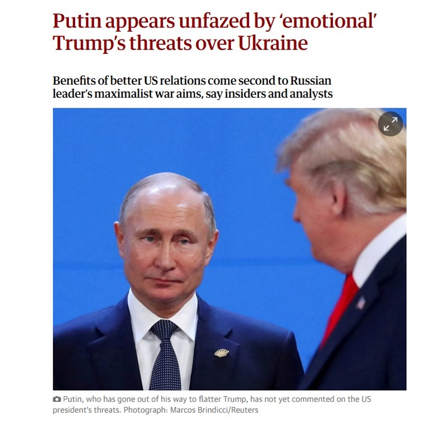 Путіна, схоже, не збентежив перший відчутний сигнал розриву Дональда Трампа з Москвою. Як кажуть аналітики та кремлівські інсайдери, російський лідер давно очікував погіршення відносин після очевидного покращення на початку другого терміну Трампа. Про це пише Тhe Guardian.